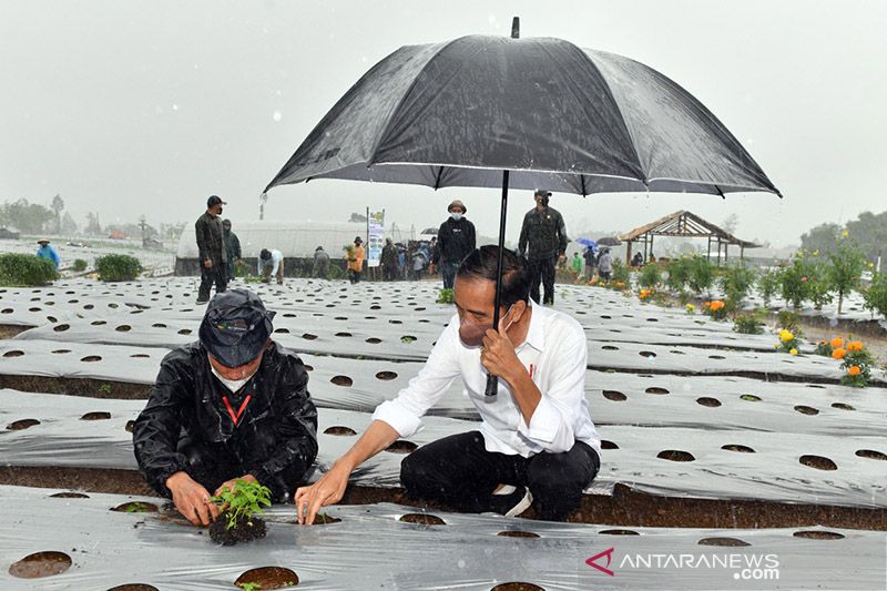 Jakarta (Beritamu.co.id) – Presiden Joko Widodo menanam cabai saat guyuran hujan deras di lumbung pangan (food estate) di Desa Lamuk, Kecamatan Kalijajar, Kabupaten Wonosobo, Jawa Tengah, Selasa.