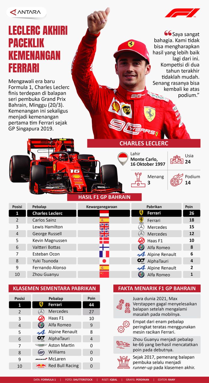 Mengawali era baru Formula 1, Charles Leclerc finis terdepan di balapan seri pembuka Grand Prix Bahrain, Minggu (20/3). Kemenangan ini sekaligus menjadi kemenangan pertama tim Ferrari sejak GP Singapura 2019.