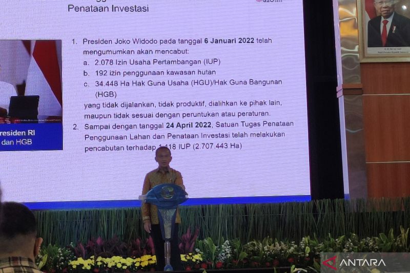 “Sampai dengan hari ini tertanggal 24 (April) yang sudah kita tandatangani IUP dicabut sebesar 1.118 (izin). Dari 1.118 izin tersebut total areal yang dicabut sebesar 2.707.443 hektare,” kata Ketua Satgas enataan Penggunaan Lahan dan Penataan Investasi sekaligus Menteri Investasi/Kepala Badan Koordinasi Penanaman Modal (BKPM) Bahlil Lahadalia dalam konferensi pers di Jakarta, Senin.