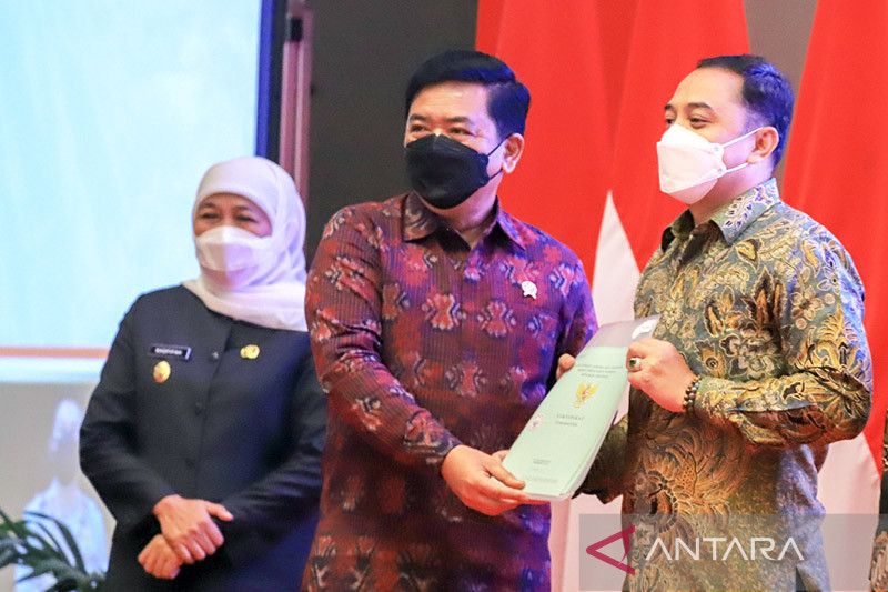 Wali Kota Eri Cahyadi juga menerima penyerahan sertifikat atas nama Pemkot Surabaya, sejumlah 176 sertifikat yang diberikan langsung oleh Menteri ATR/BPN Hadi Tjahjanto.