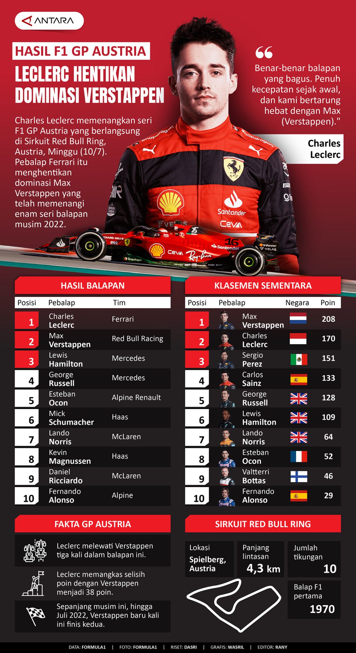 Berita ini sudah di terbitkan oleh di (https://www.antaranews.com/infografik/2989357/hasil-f1-gp-austria-leclerc-hentikan-dominasi-verstappen)