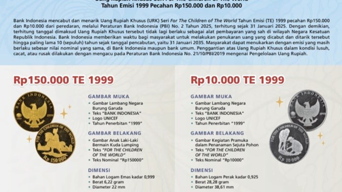 Beritamu.co.id – Bank Indonesia (BI) secara resmi mencabut dan menarik uang rupiah khusus seri For The Children of The World Tahun Emisi (TE) 1999 dari peredaran. Uang rupiah khusus itu dengan nilai pecahan Rp150 ribu dan Rp10 ribu.
